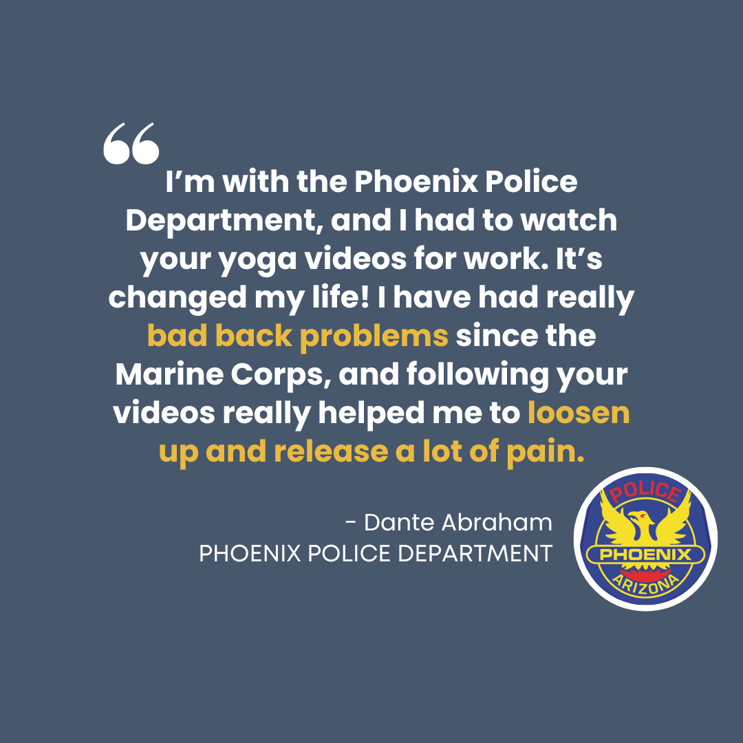 “I'm with the Phoenix PD, and I had to watch your yoga videos for work. It's changed my life! I've had really bad back problems since the Marine Corps, and following your videos has helped me to loosen up & release a lot of pain."